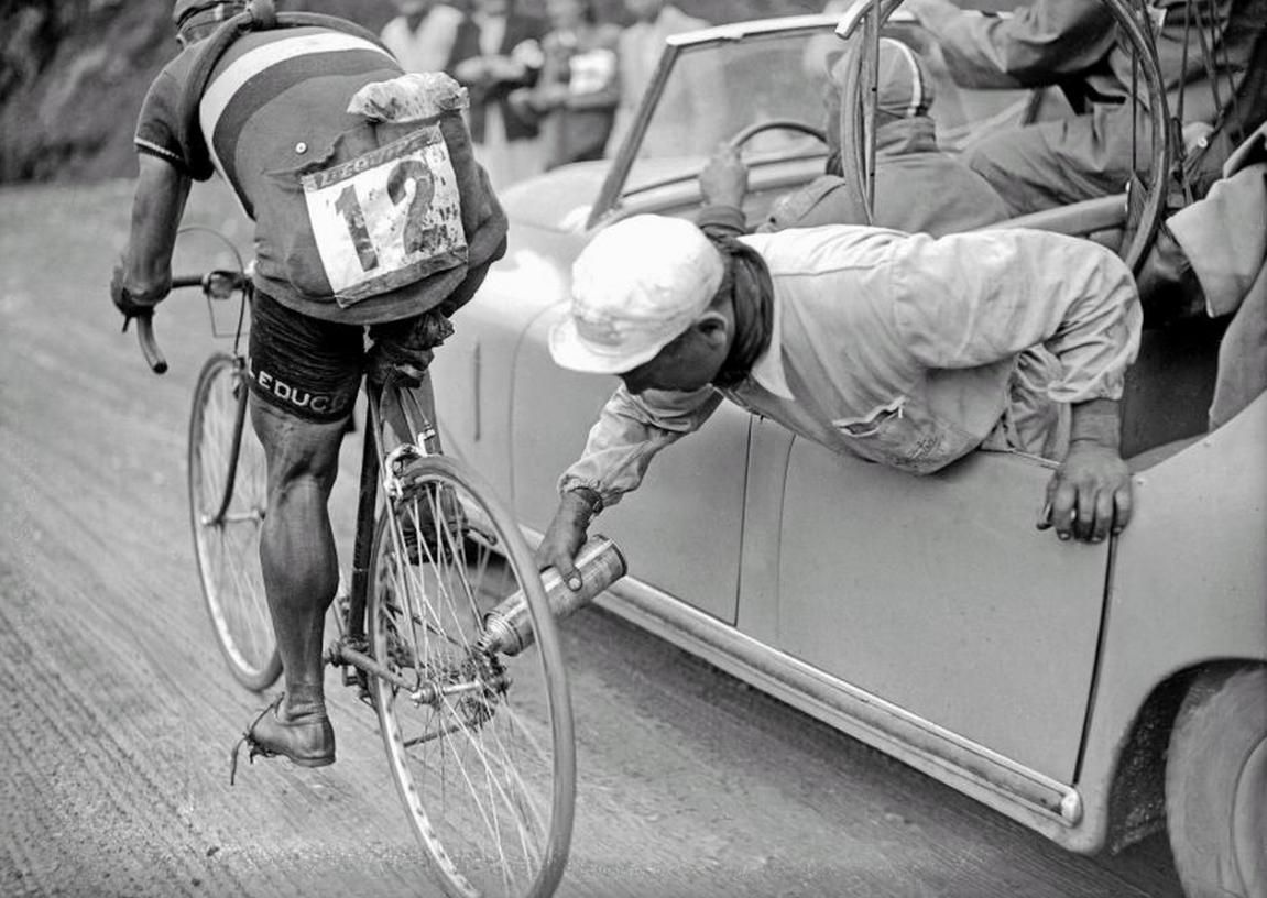 Back in Hawai’i after I realized I was a failed racer, as Trump might say, I rode motorcycle escort for the peloton on some of the big races. I made a wooden jig to hold two milk bottle crates, one on each side of the motorcycle looking like panniers. Filled them with water bottles for in flight refueling. I would pull forward of the peloton and it would break into two columns, one on either side of the motorcycle. I’d slow down and riders would ride by and grab a new bottle. Then zoom on up to the rest of the auto caravan to refill the motorcycle “panniers”.